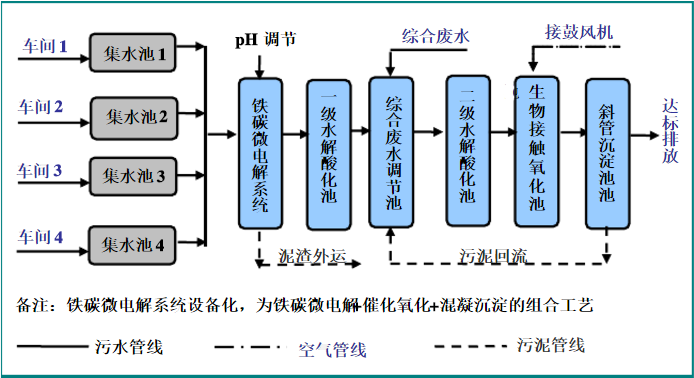 各類(lèi)生產(chǎn)線(xiàn)的廢水進(jìn)行單獨收集,之后統一送入初調節池中進(jìn)行水質(zhì)的調節,;預處理采用“鐵碳微電解+催化氧化+混凝沉淀”工藝,沉淀溢流到一級水解酸化池中,之后流入到綜合調節池中,與生活污水、清潔下水混合后,送入二級水解酸化池,水解后出水至生物接觸氧化池中進(jìn)行好氧處理,處理后水進(jìn)入沉淀池中,上清液排放。